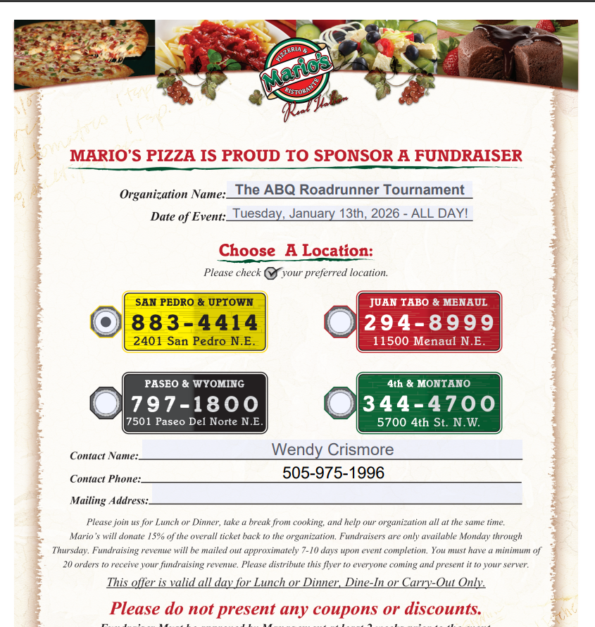 Take a break from cooking, and join us for Lunch or Dinner to help us raise money for The Albuquerque Roadrunner Tournament 2026 all at the same time.